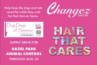 This summer Changez Salon is collecting Items for the Hazel Park Animal Control shelter to help their mission of getting dogs and cats ready for their forever home. Food and toys and snacks are already piling up in our lobby for Dog Days of Summer and Cats, too! We’re also seeing paper towels and Kleenex, and bleach.