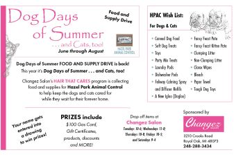 We are collecting supplies for the Hazel Park Animal Control Shelter now through the end of August for Dog Days of Summer … and Cats, too! This is the third year that our Hair that Cares drive is doing this because we love animals and because our stylist, Caitlin is a volunteer for this shelter.