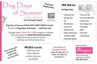 Dog Days of Summer, and Cats, too! is also a raffle. You get an entry into the RAFFLE when you bring your donations to Changez Salon. Prizes are varied and t